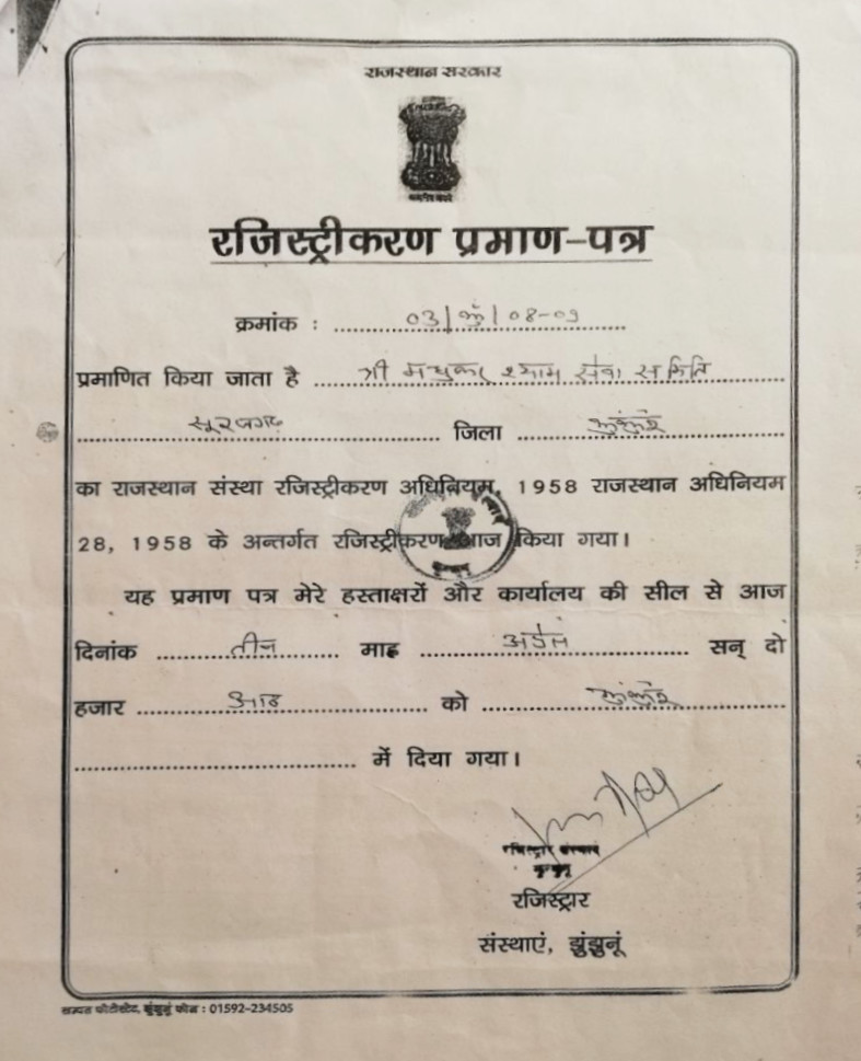Shri Madhukar Shyam Seva Samiti, Jhunjhunu was Started in 2008.